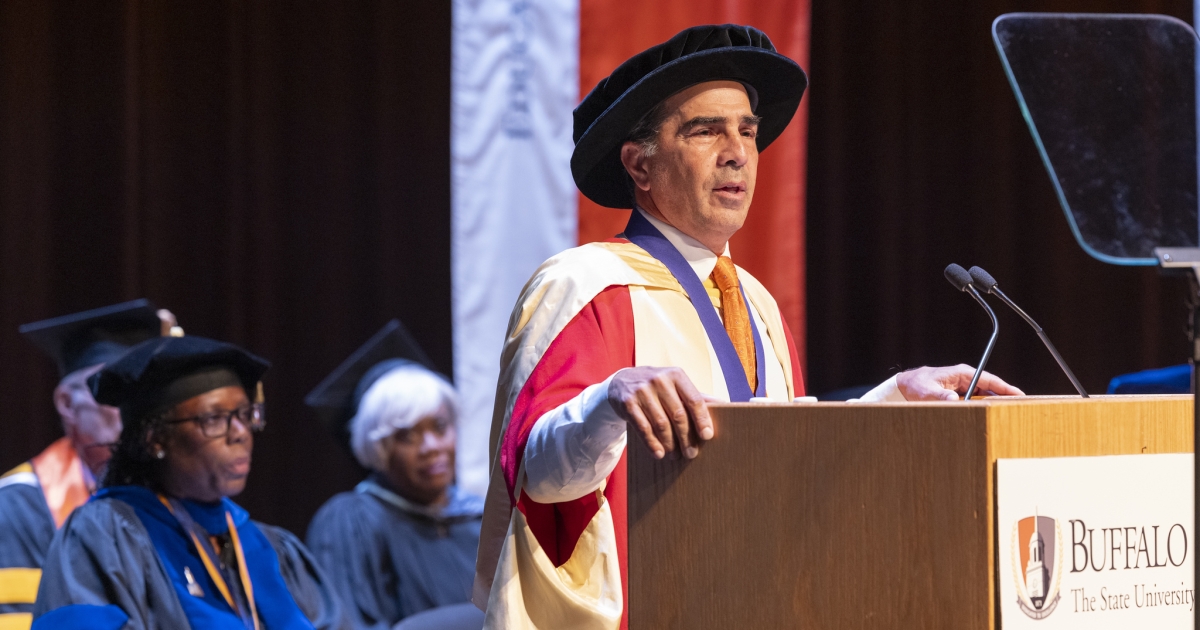 Gerard J. Puccio, Ph.D., SUNY distinguished professor of creativity and change leadership, presented the Convocation Address at Academic Convocation, a tradition that recognizes select faculty and staff members with President’s and Chancellor’s Awards for Excellence for their extraordinary efforts on behalf of the university, recognizes significant awards and major grants of faculty and staff members, and welcomes all new employees to campus. Interim President Bonita R. Durand, Ph.D., offered congratulatory remarks.